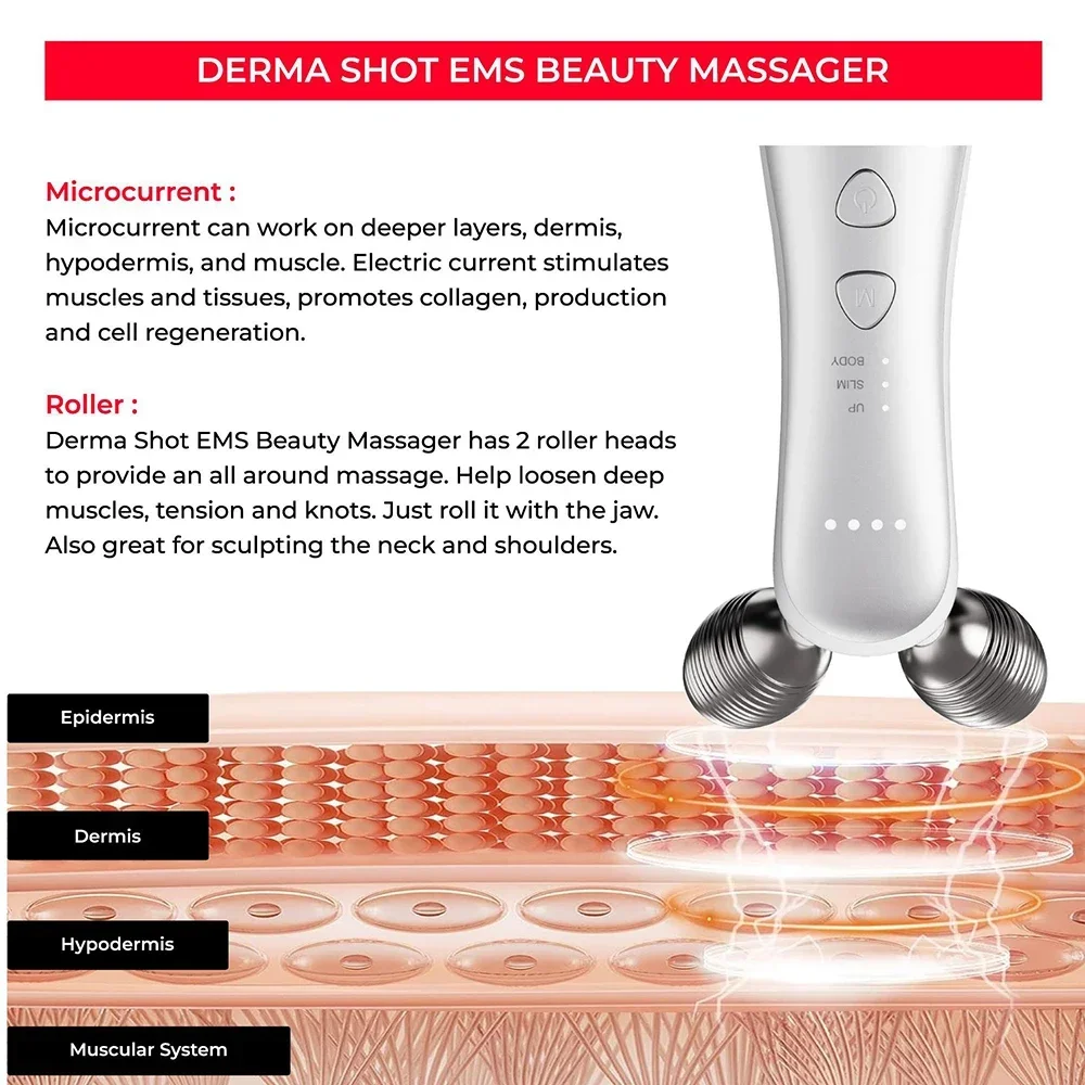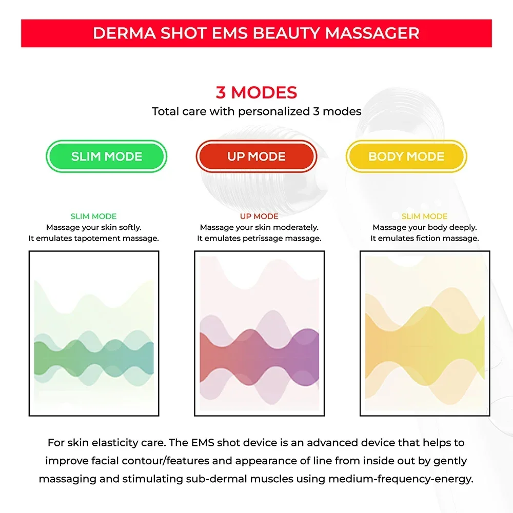 Massage your body deeply. Helps to improve body contour and appearance of line from inside out by massaging and stimulating sub-dermal muscles using micro-current.