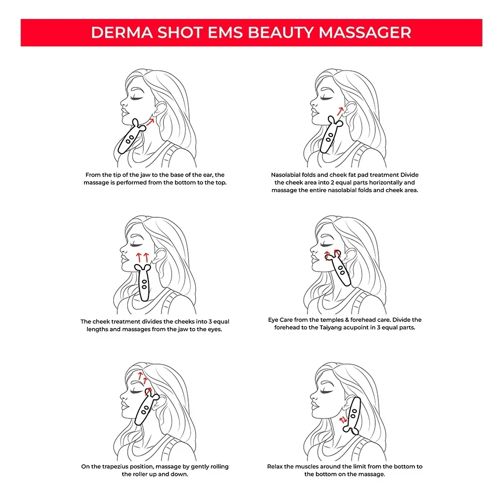 Massage the desired area from the bottom up. It is recommended to follow the nasolabial folds>nasolabial folds>cheek muscles>eyes and sun six and forehead.