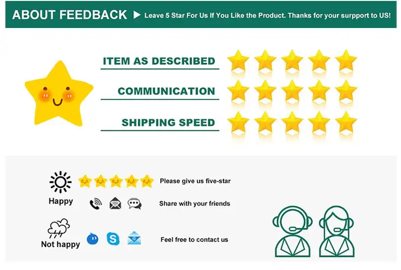 If you are satisfied with our service and products, please leave us a positive feedback.your generously 5 STARS nice feedback is a huge motivation for us.