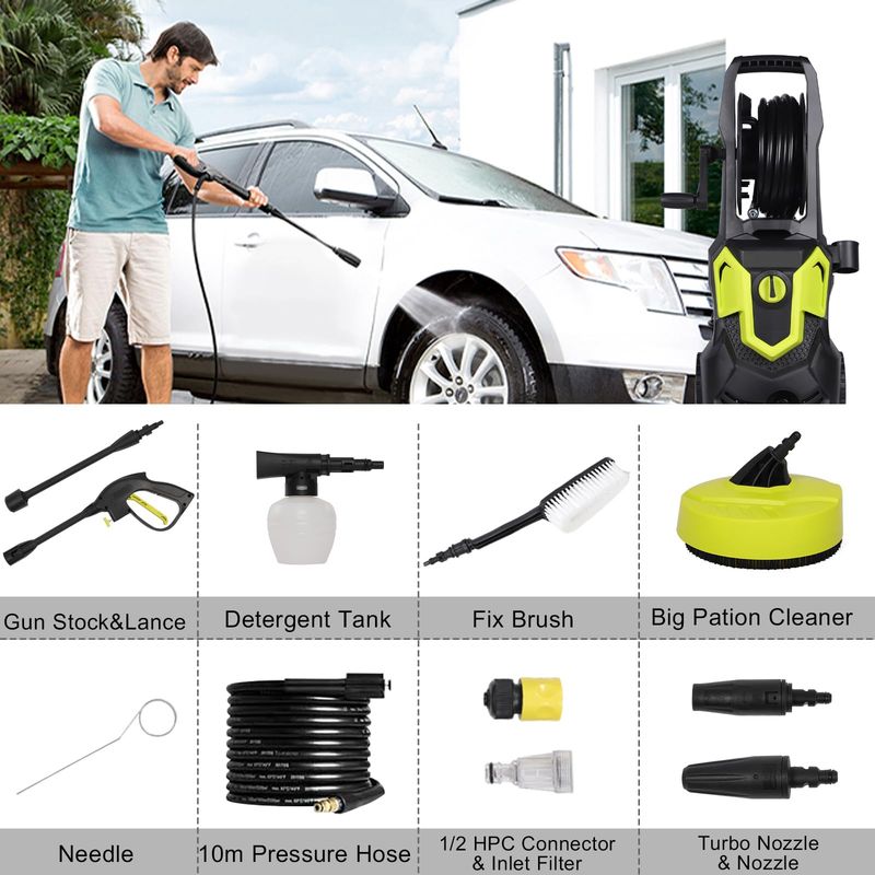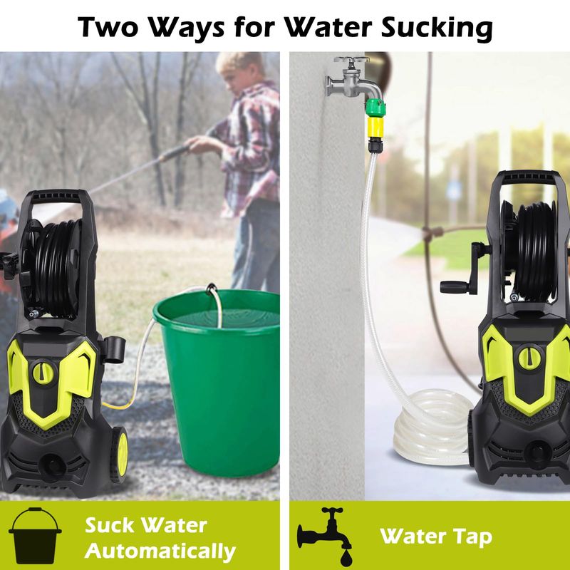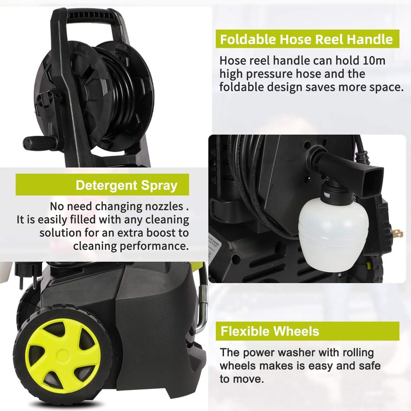 【On Board Hose Reel】---32ft electric high power washer hose is long enough for the projects you need it for, the built in on-board hose reel to conveniently protect and helps prevent kinks in the high-presure hose and makes winding or unwinding a simple task.