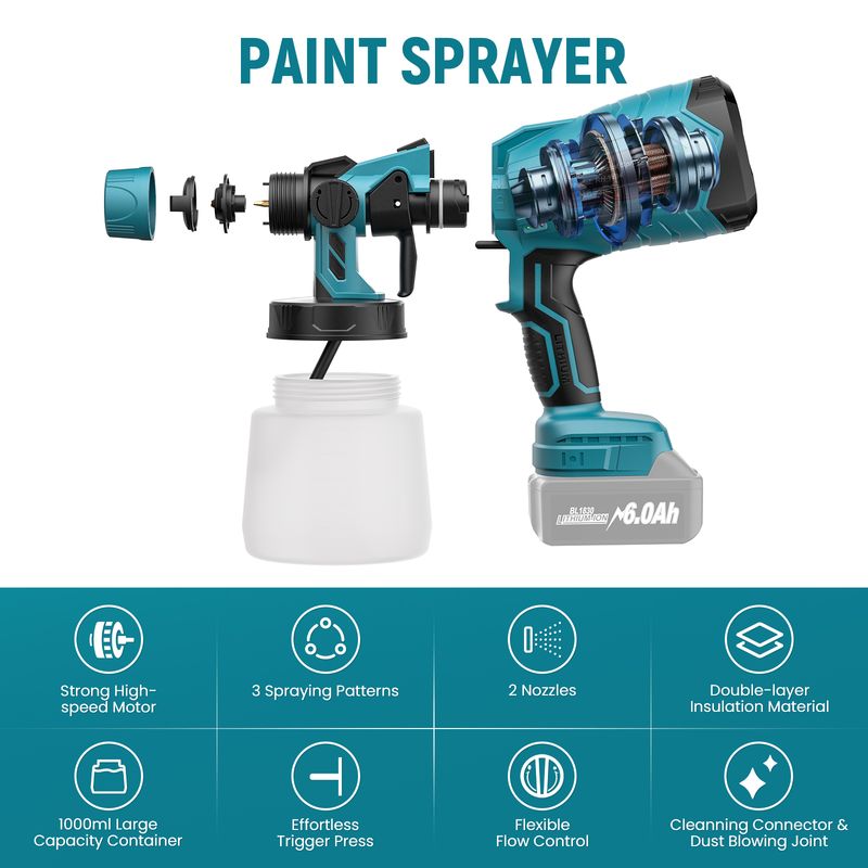 ● Free to regulate the paint output by adjusting the flow control knob on the sprayer.