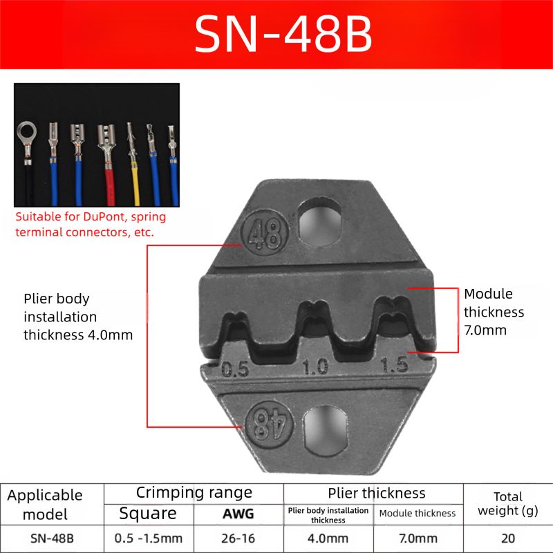 The clamp installation holes of the frame are suitable for the clamps of most 9-inch ratchet crimping clamps on the market. The thickness of the clamp socket is 4.0mm. Different terminals can be crimped by choosing the corresponding numbered clamps at a low cost for replacement and installation.