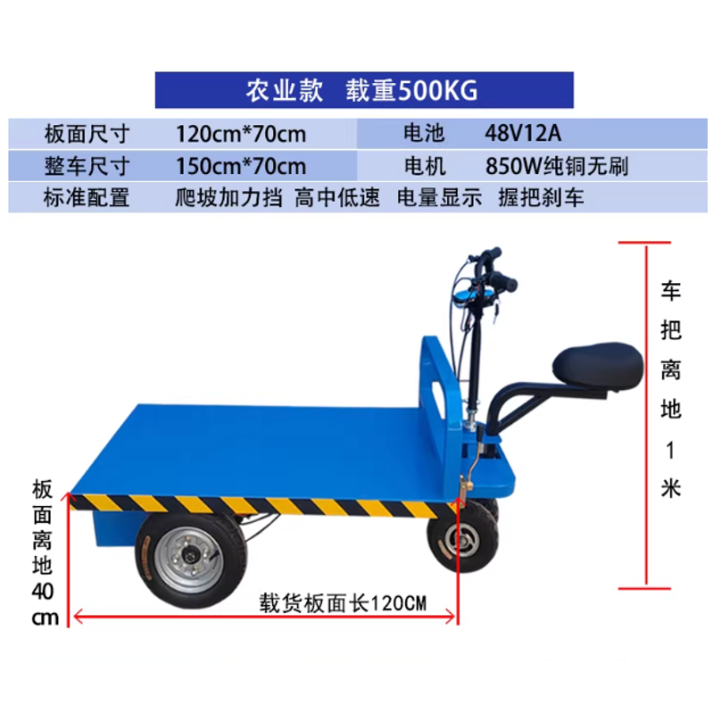 Product description: the truck is riding backwards to pull goods and set up stalls, and the truck is used in grain, oil, tobacco and alcohol supermarkets, orchards and greenhouses.