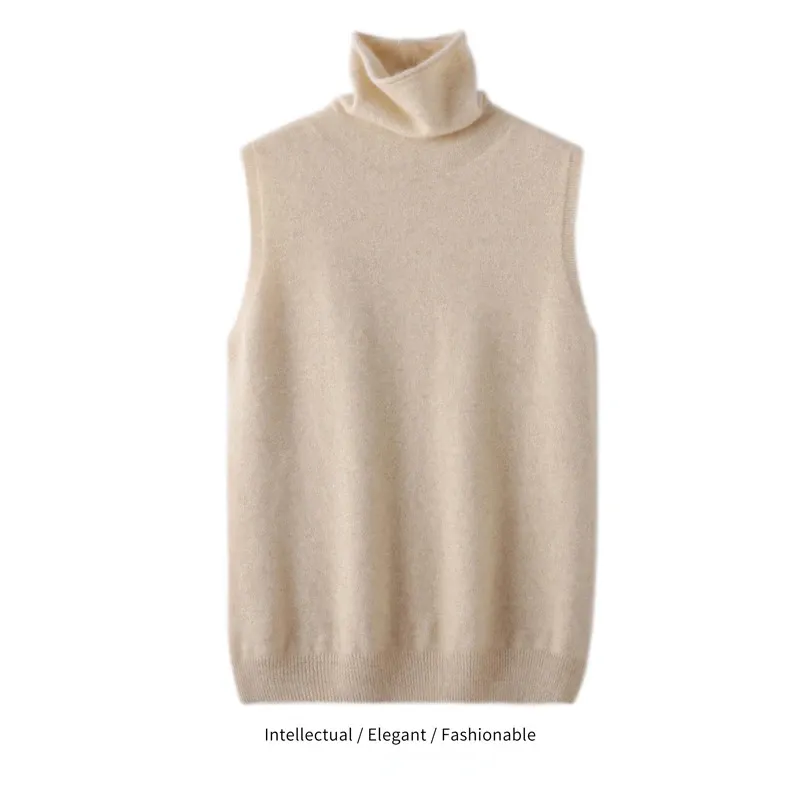 Elegant British Style 100%Wool Turtleneck Ladies Sweater Sleeveless Tank Tops 2024 Autumn Slim Soft And Warm Knitted Women Vests