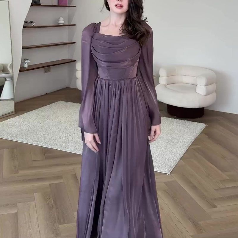 Elegant Glitter Long Party Dress Women Pleated High Waist Full Sleeve Female Dresses 2025 Spring Lady Solid Vacation Robes New