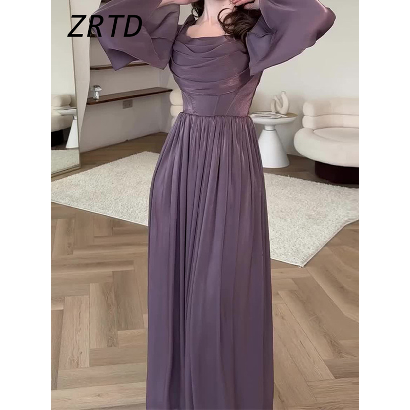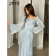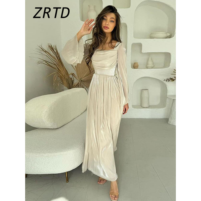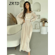 Elegant Glitter Long Party Dress Women Pleated High Waist Full Sleeve Female Dresses 2025 Spring Lady Solid Vacation Robes New