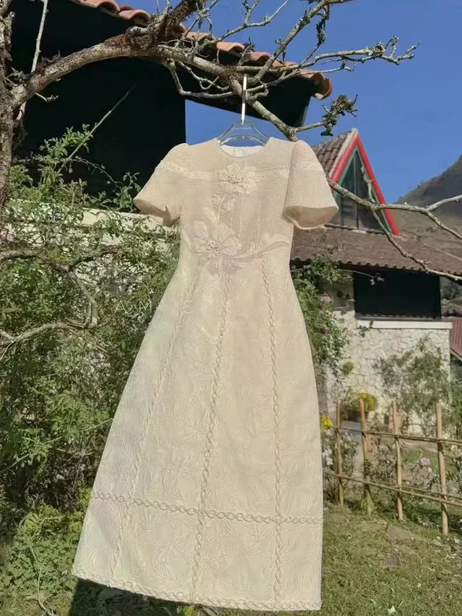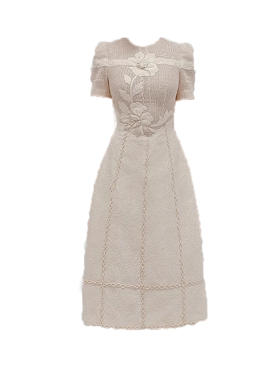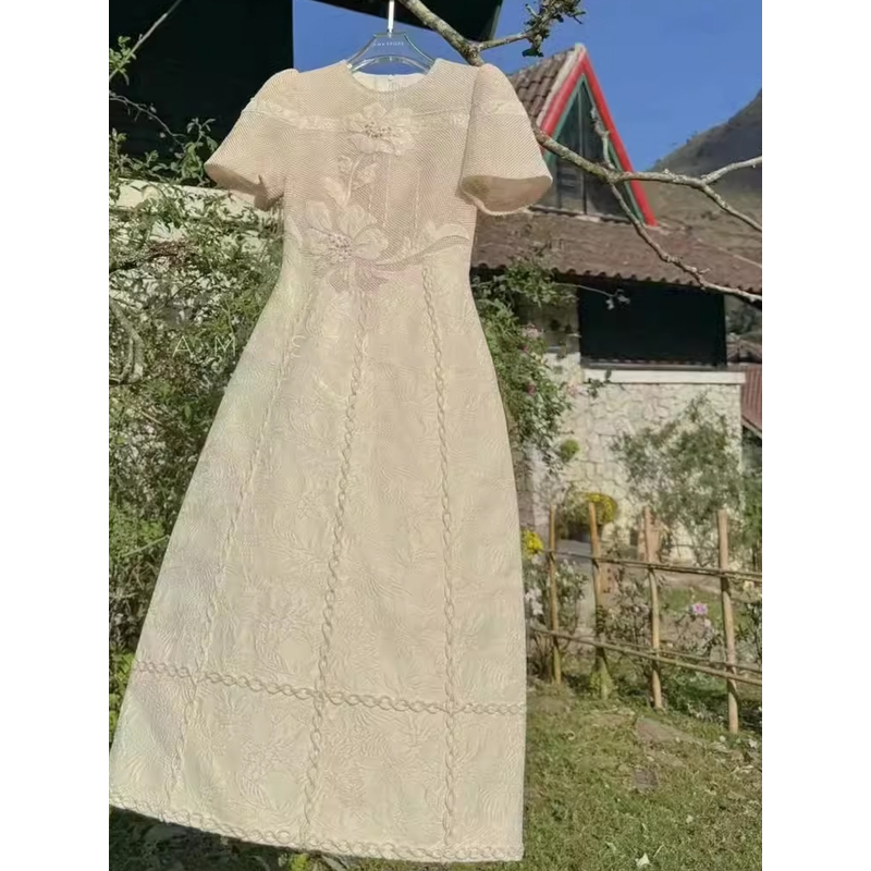 Elegant Lace Sweet Lady Dress Slimming High Waist A-Line Skirt Long Dress for Banquet And Daily Wear Short Sleeve round Neck
