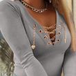 Elegant Long Sleeve V-neck Solid Color Chain Women's Casual T-shirt Gray 2XL