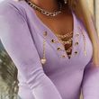 Elegant Long Sleeve V-neck Solid Color Chain Women's Casual T-shirt Purple L