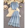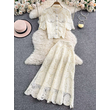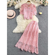 Elegant Pearl Long Dress Suits Women 2 Piece Sets Summer Short Sleeve Flower Embroidery Lace Shirt A Line Midi Skirt Sets