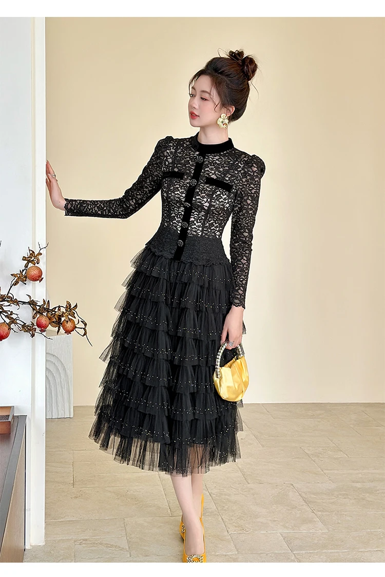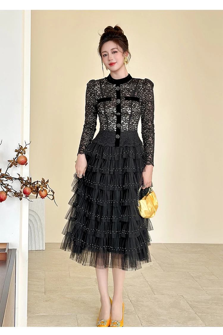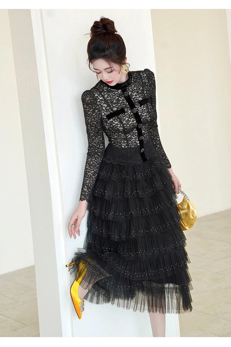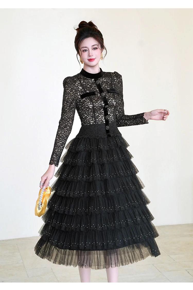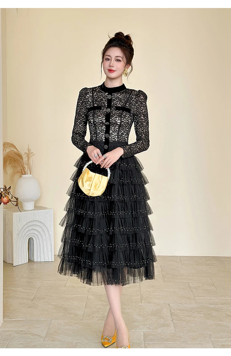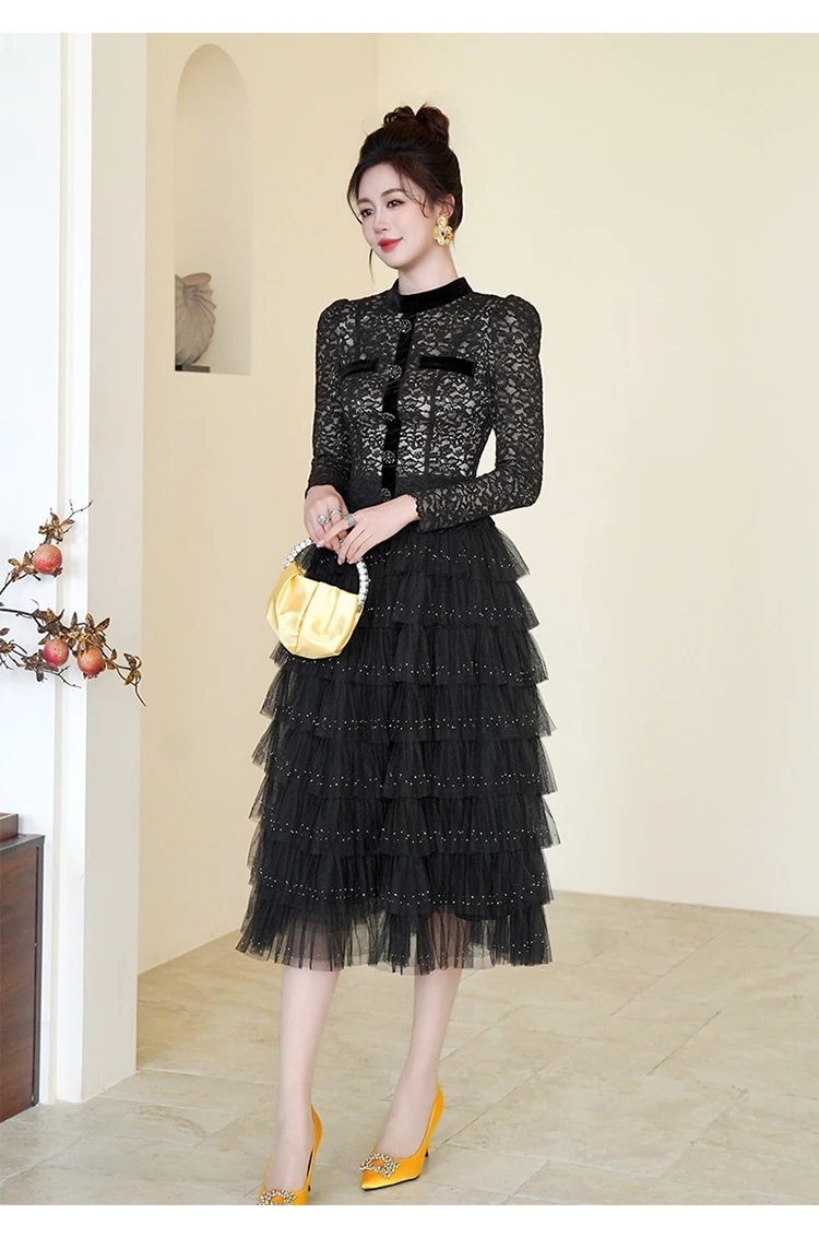 Elegant Sweet Tulle Cake Dress Women's Luxury Black Sheer Lace Diamond Single Breasted Tiered Ruffle Robe Banquet Party Vestidos
