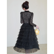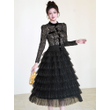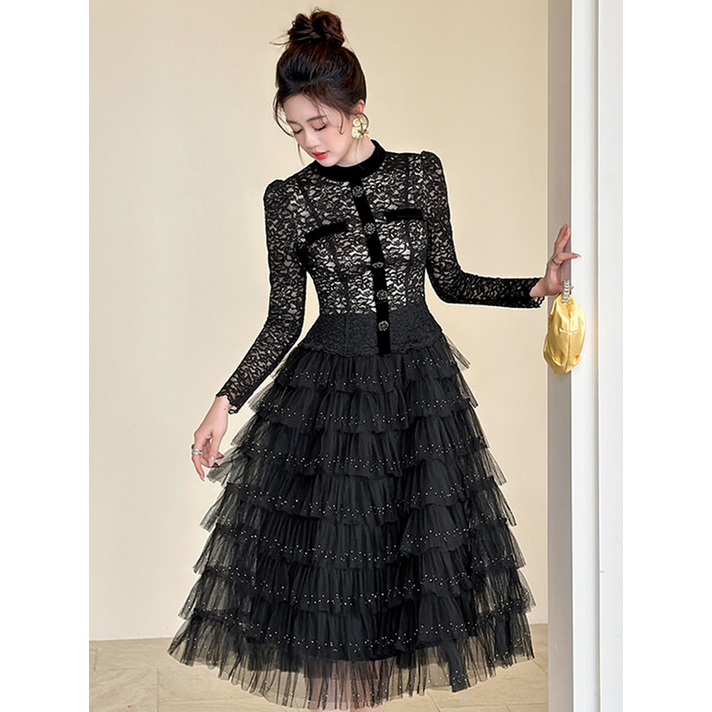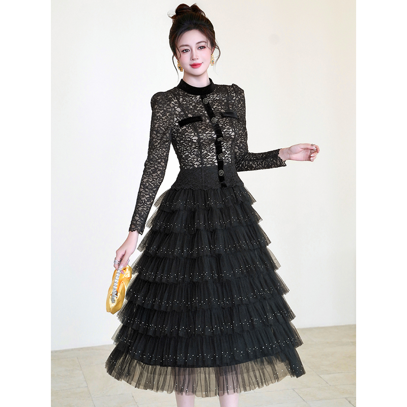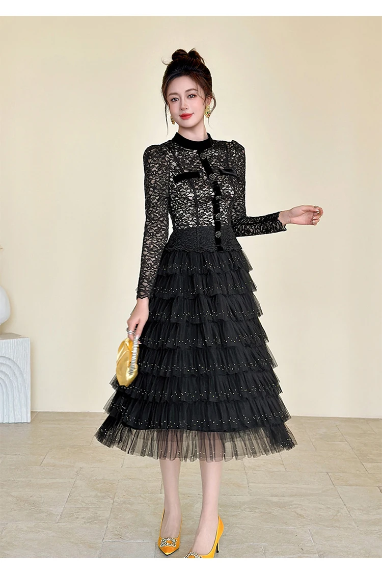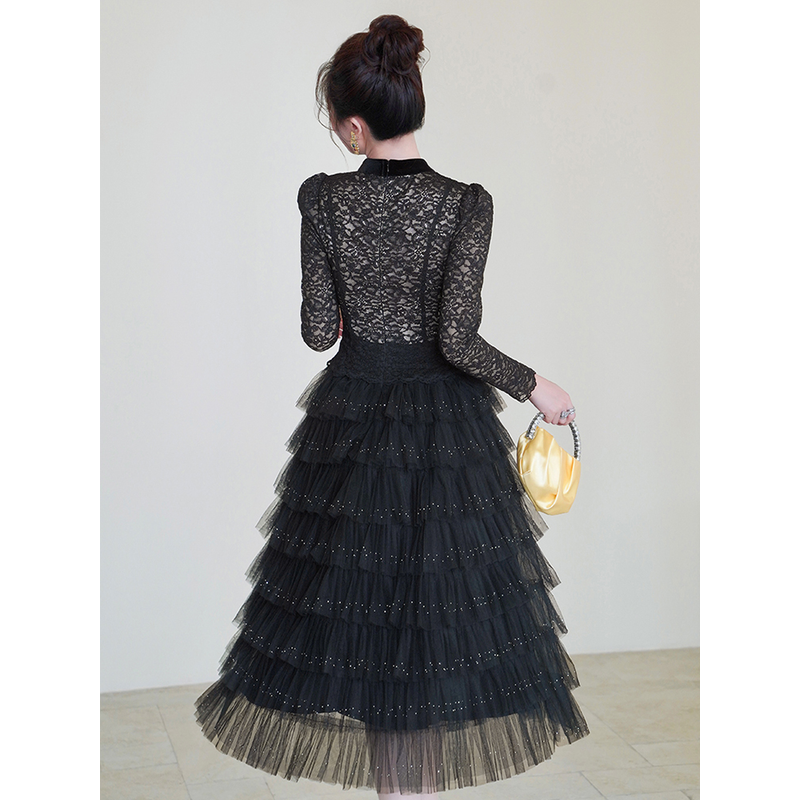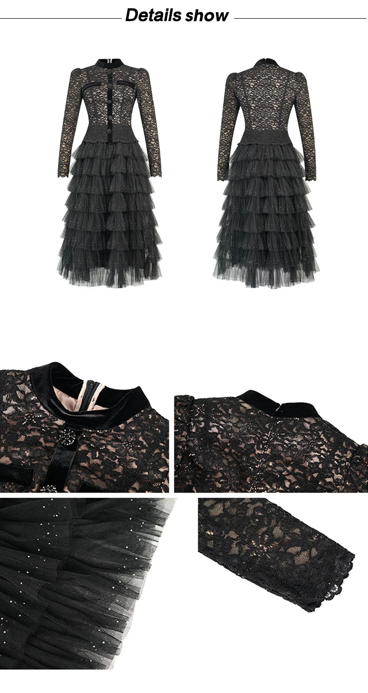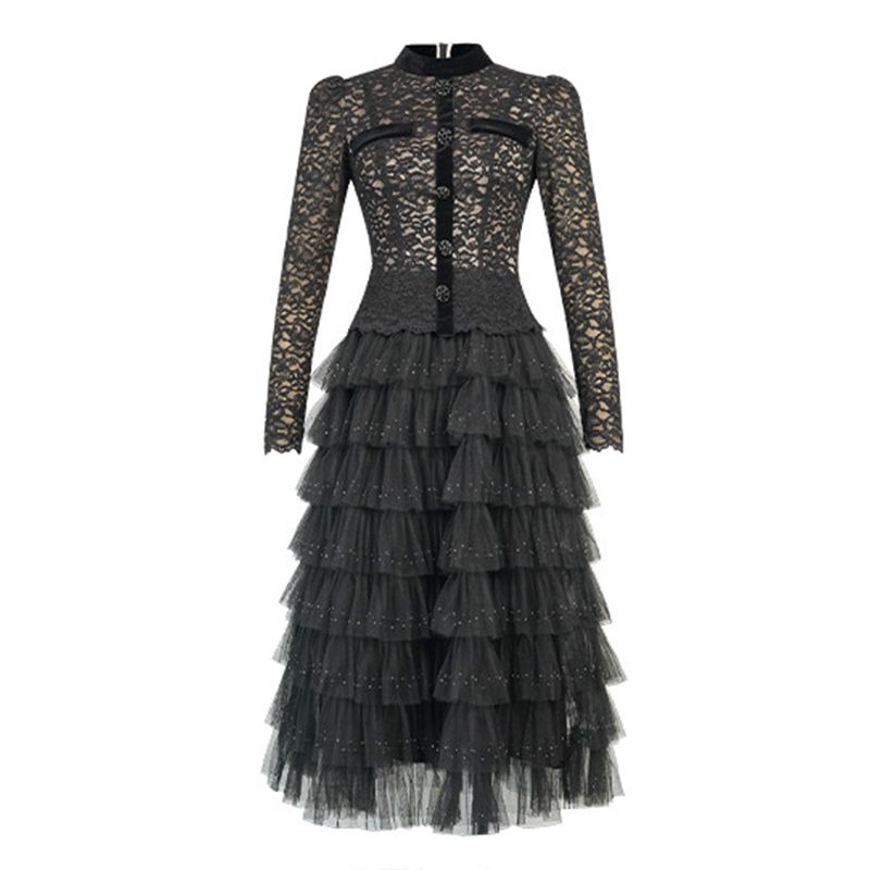 Elegant Sweet Tulle Cake Dress Women's Luxury Black Sheer Lace Diamond Single Breasted Tiered Ruffle Robe Banquet Party Vestidos