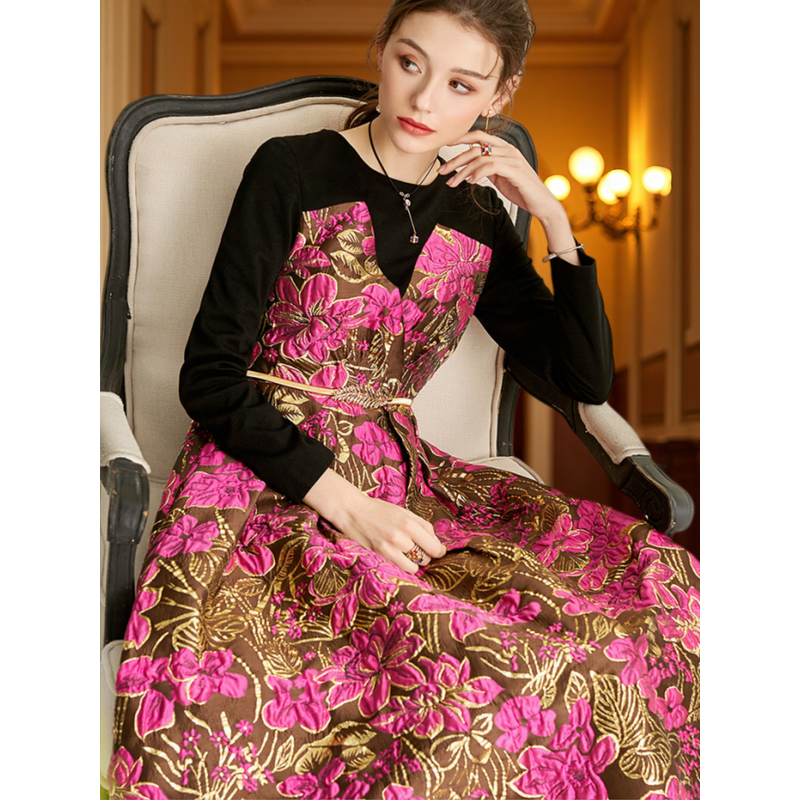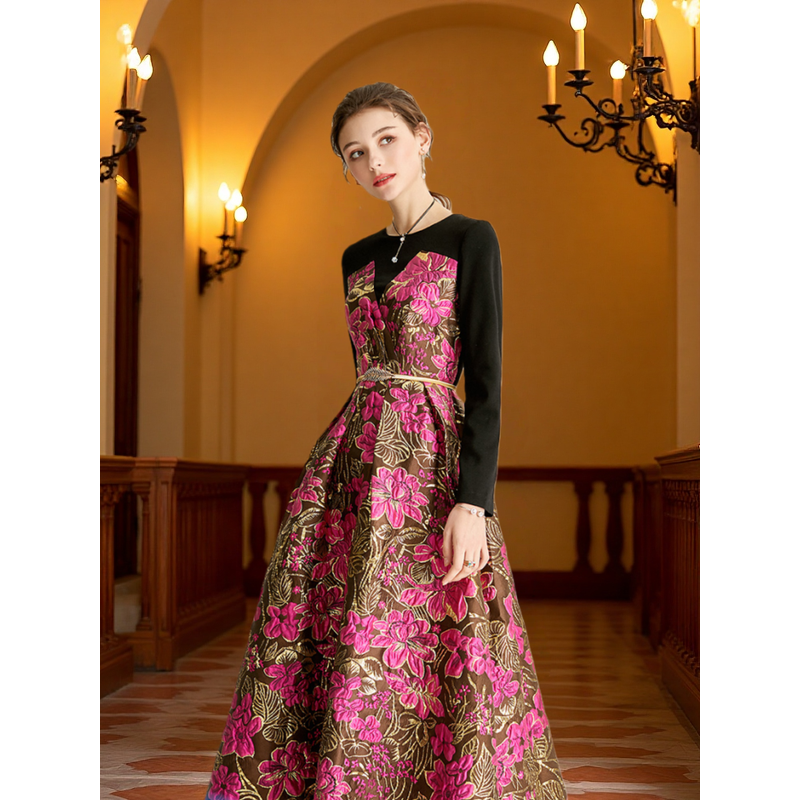 Elegant Women Long Maxi Jacquard Dress New Party Evening Spliced ​​Spring Autumn Vintage Floral Ball Gown