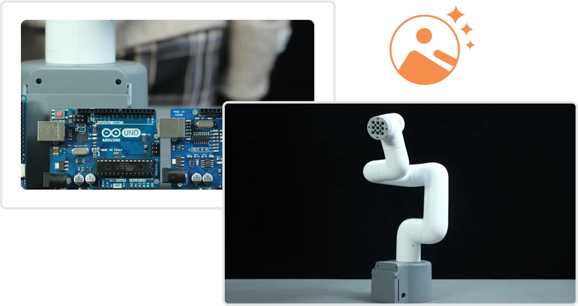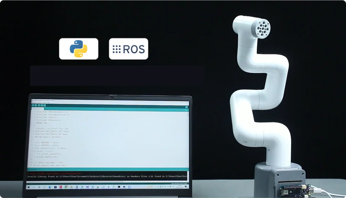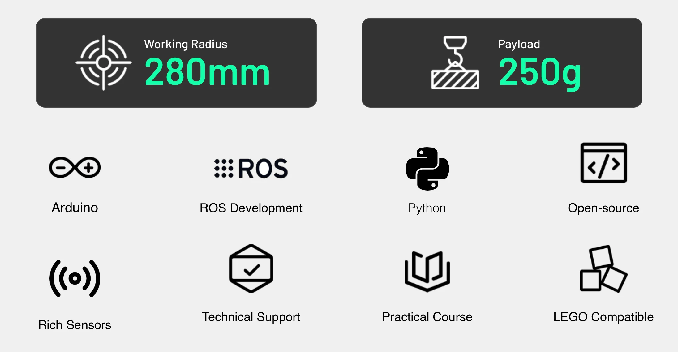 Equipped with Arduino hardware interfaces, dozens of end effectors, and LEGO interfaces at the end, myCobot 280 for Arduino is able to connect various sensors to realize color recognition and tracking, QR code & gesture recognition, voice broadcasting, etc., so that you can build a perfect programming environment for ER myCobot 280 for Arduino from scratch.