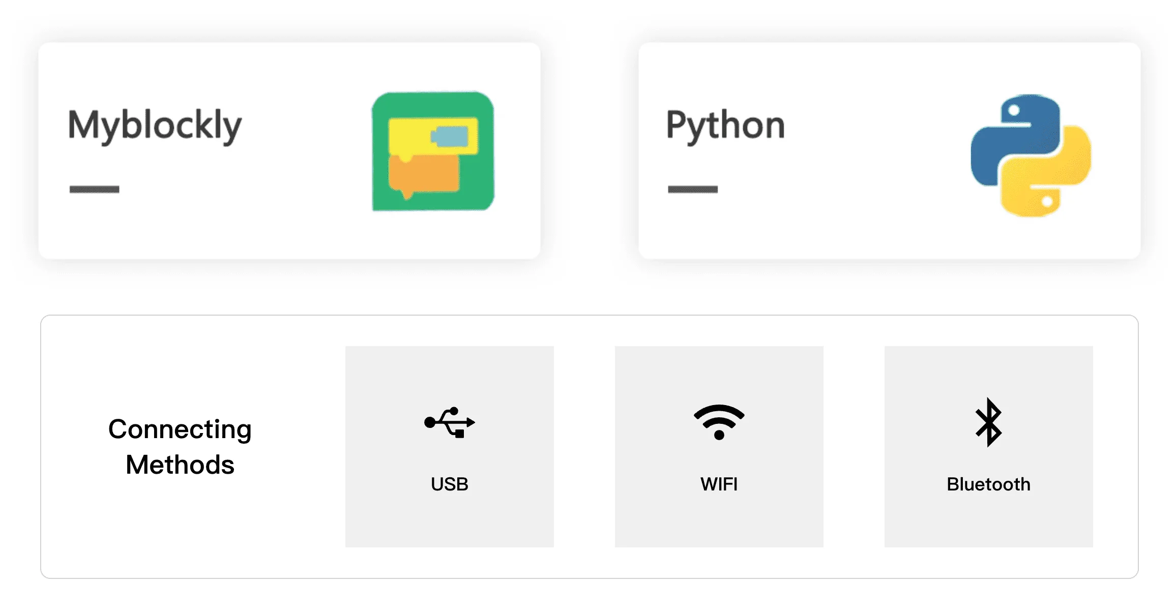 We support the Arduino system by default, and provides product corresponding drive library files. If you want to program by the mainstream programming platform such as Python or MyBlockly and ROS, you’re supposed to flash official firmwares or develop firmwares by yourself.