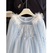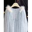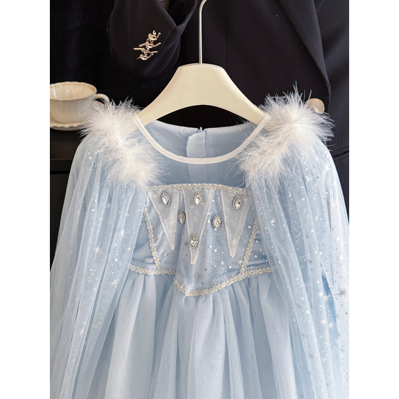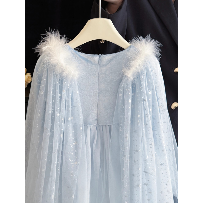 Dramatic Detachable Cape: Includes a matching light blue tulle cape with faux fur trim and gold sequin details, easily removable to create two distinct looks – simple elegance or full royal grandeur.