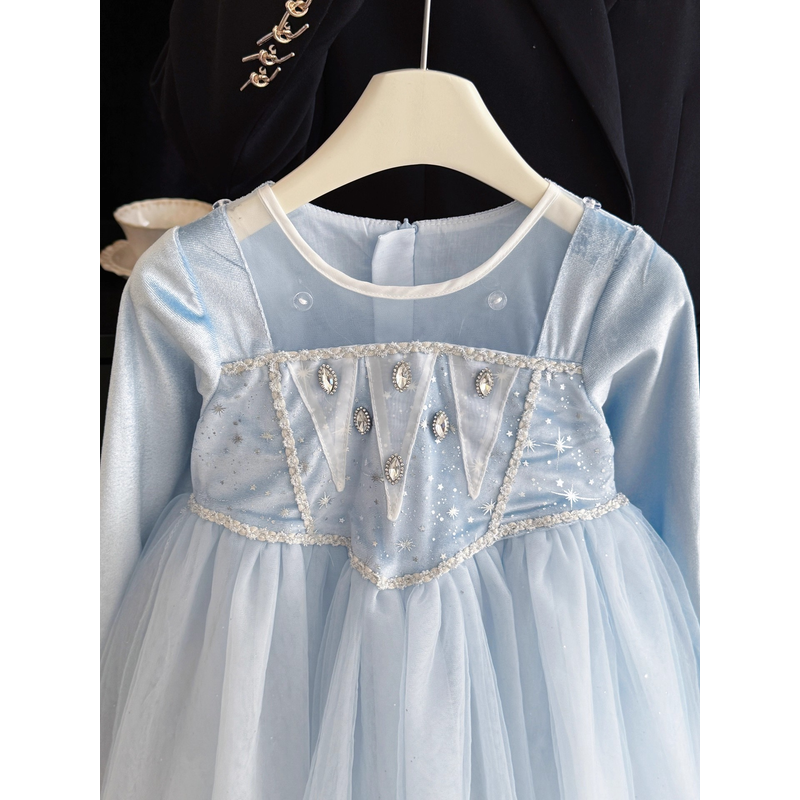 ✨ Enchanting Elsa Design: This stunning light blue velvet dress features sparkling gold star and snowflake sequins on the bodice and tulle, perfectly capturing the magical Frozen princess fantasy.
