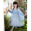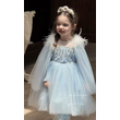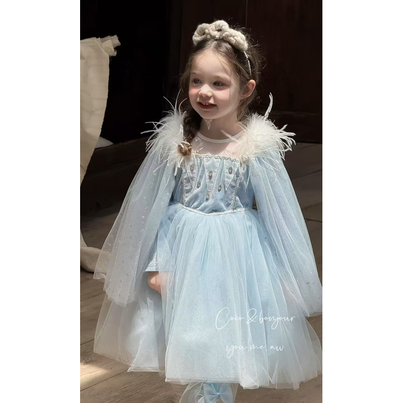 Dramatic Detachable Cape: Includes a matching light blue tulle cape with faux fur trim and gold sequin details, easily removable to create two distinct looks – simple elegance or full royal grandeur.