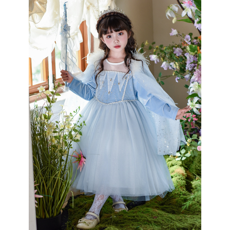 Dramatic Detachable Cape: Includes a matching light blue tulle cape with faux fur trim and gold sequin details, easily removable to create two distinct looks – simple elegance or full royal grandeur.