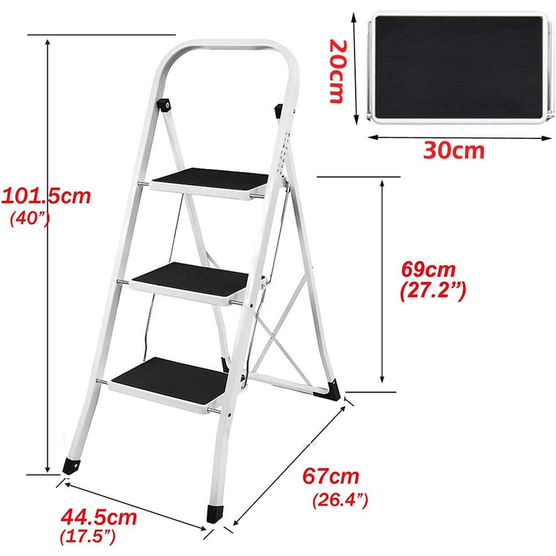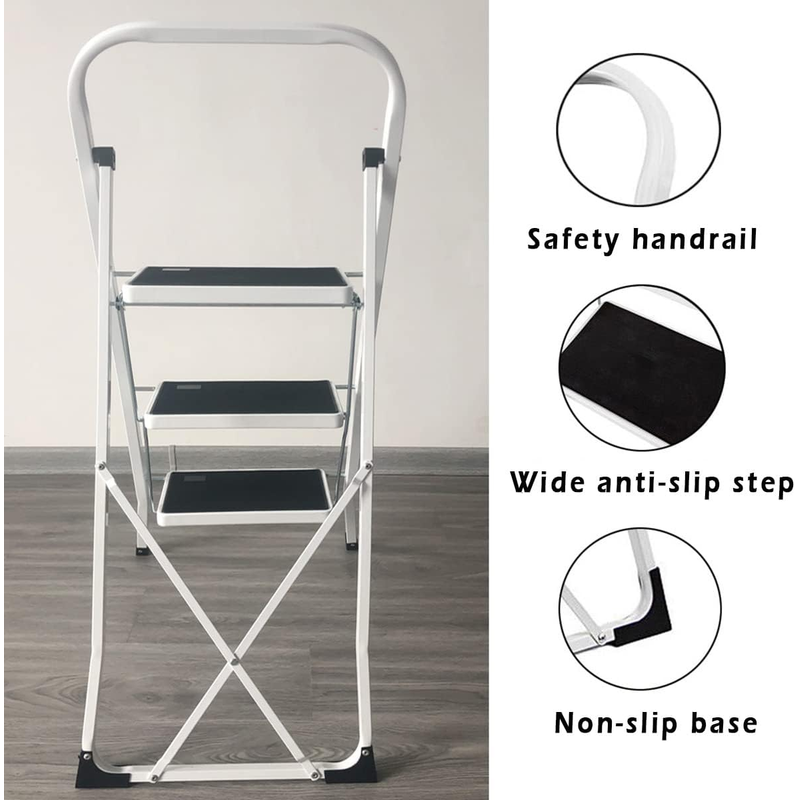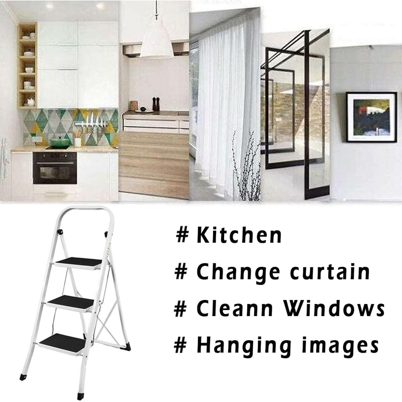 Stability Upgrade: The 3 step ladder added metal support and thickened the steel frame, and used safety lock design to fix the ladder. When you use it, simply push down the top pedal until the safety locking mechanism is automatically locked in place. Rust-resistant steel frame with safety locking mechanism, strong and reliable structure.