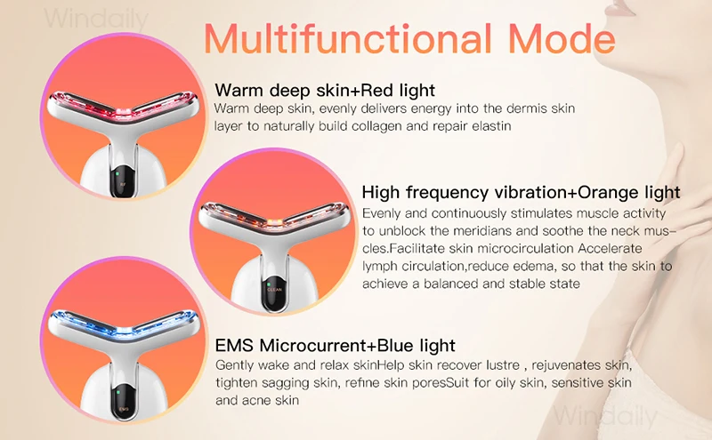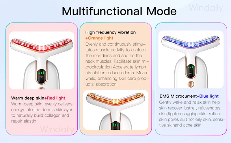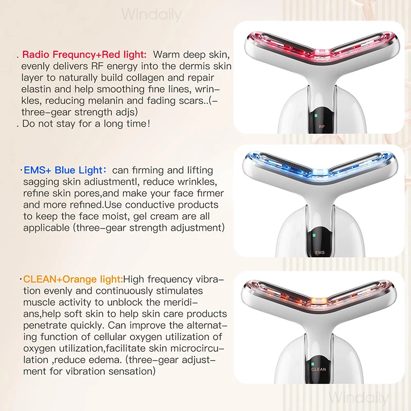 This face massager comes with EMS, vibration, warm deep skin function and 3 colors mode, adjustable mode to meet your various needs.