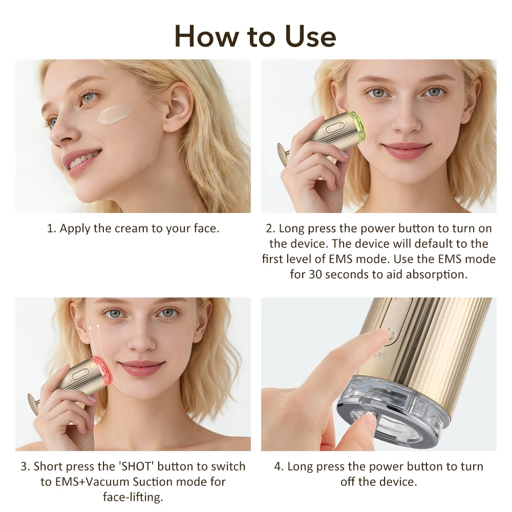 After applying cream, first use the device's EMS mode for 30 seconds to aid absorption. Then switch to EMS+Vacuum mode for lifting. (Note: When the cream is in a clumpy state, it may cause the filter to clog.)