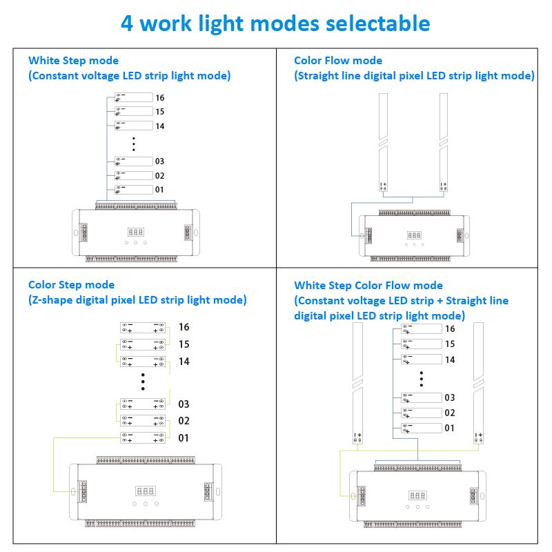 ● 32 channels single color LED strip supported, Max 1A current per channel.