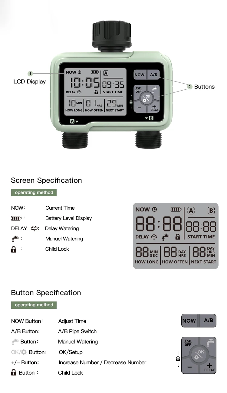 2 Independent Watering Zones: Our sprinkler water timer features 2 separate water outlets, each programmable using the "A/B" buttons. Customize watering schedules for each zone independently, ensuring no interference between them. It allows for efficient management of large-scale irrigation, saving you time and effort in garden or farm maintenance.
