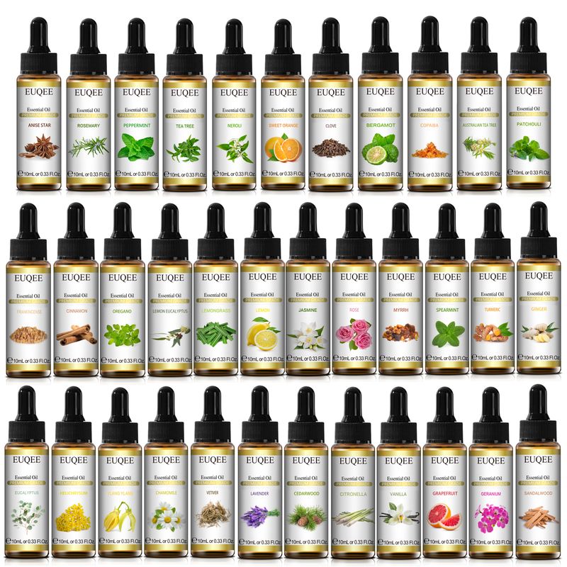 EUQEE have 44 different scents of essential oils, essential oils are aromatic, concentrated plant extracts that are obtained through steam distillation, cold pressing, or resin tapping. Simply add a couple drops to any aromatherapy diffuser and fill your entire room with that lovely smell. You also can use in diy soaps, candles, burners, baths, massage and skin care as well other uses.