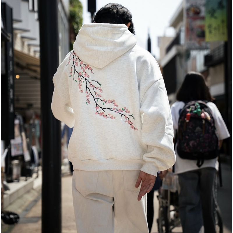 European And American Autumn And Winter Cherry Blossom Hooded Sweater Men And Women Street Hip Hop Retro Light Gray XL