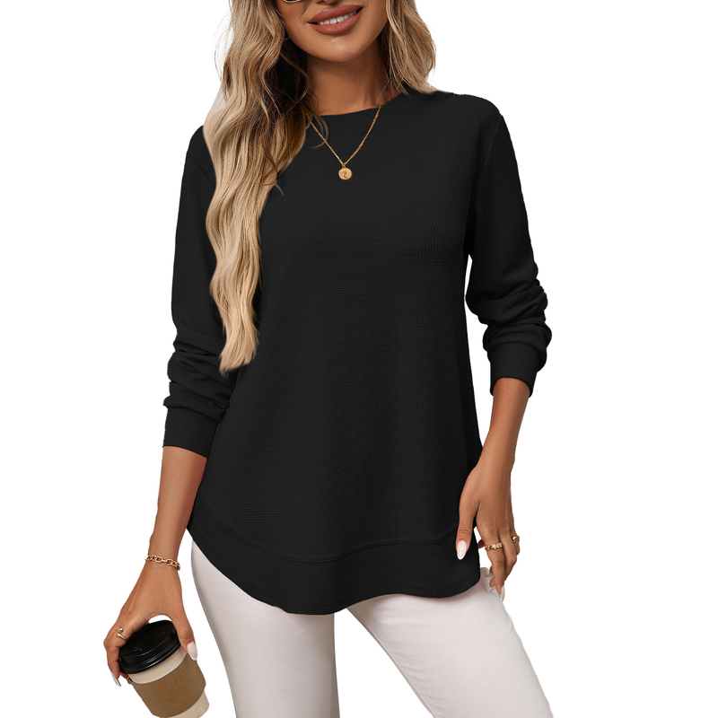 European And American Loose Waffle Casual All-match T-shirt Knitted Long Sleeve Black S