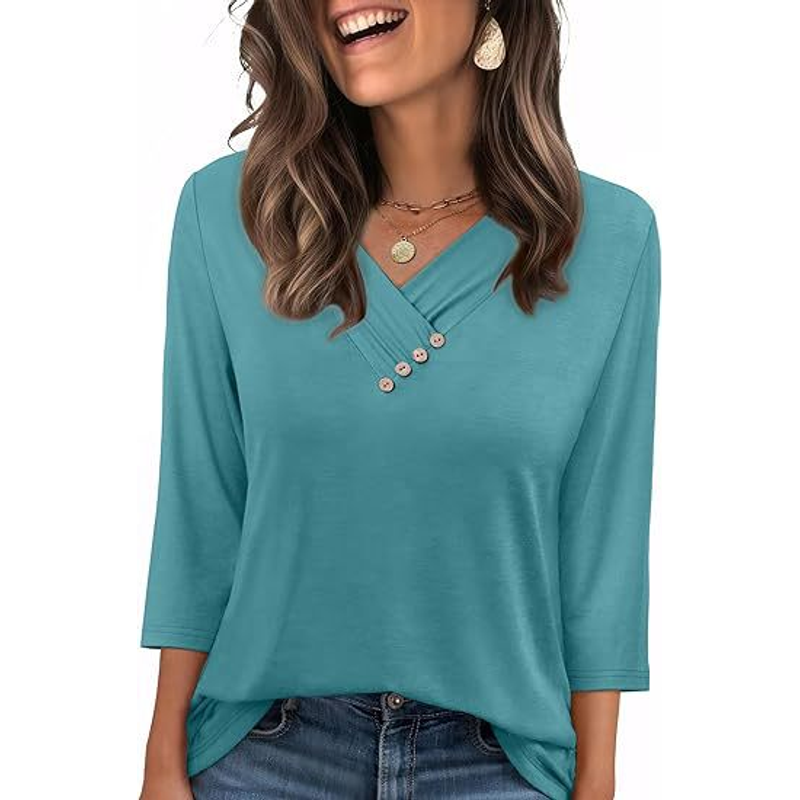 European And American New Autumn Women's Clothing Button V-neck Fashion Casual Sleeve T-shirt Blue Green S