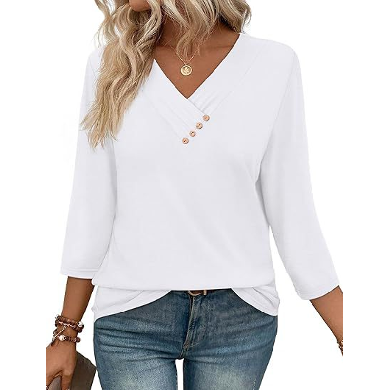 European And American New Autumn Women's Clothing Button V-neck Fashion Casual Sleeve T-shirt White XXL
