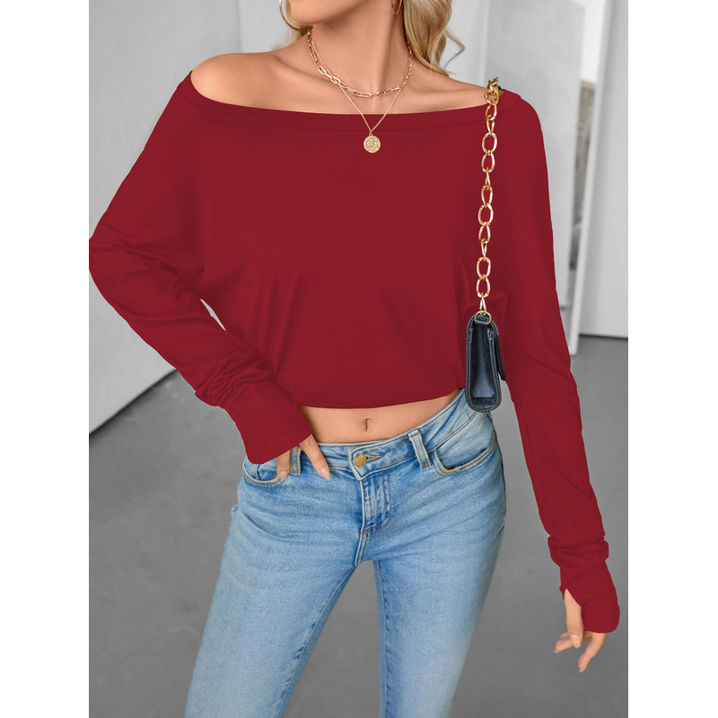European And American Style Women Shoulder Long Sleeve T-shirt New Midriff-baring Top Red S