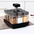 FEATURE– The set Includes 8-glass spice bottles with air-tight lids measured at 3.75"x1.7", and 1 rotating organizing caddy measured at 6.3"x4.7". Material: BPA-free plastic and glass, stainless steel handle. A clear glass jar makes it easy to see the spices inside. No assemble needed. Easy to clean up, just wipe with a damp cloth.
