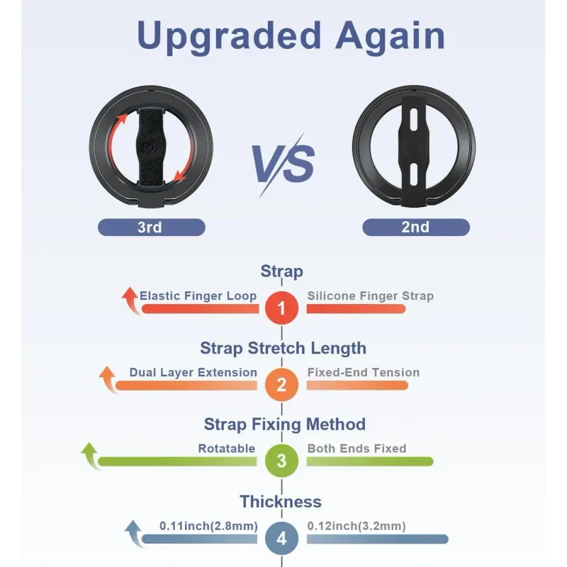 Comfortable Elastic Phone Grip: This strap features a more comfortable and highly stretchable, high-elastic strap. With its extended length, it greatly reduces the pressure on the fingers when using the strap. The strap is fixed on a rotatable inner ring, allowing you to easily adjust your phone to the most comfortable angle while using the grip.