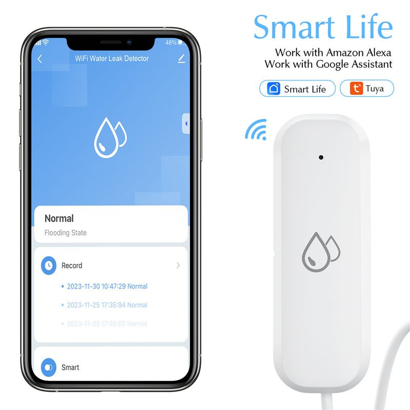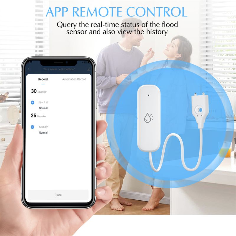 A water immersion sensor that can detect water leakage in the environment in real time. When water immersion is detected, the detector will send an alarm signal to the host and report the information to the user's mobile phone. When the water level at the detection point reaches 0.5mm, the water intrusion sensor will report the water condition.