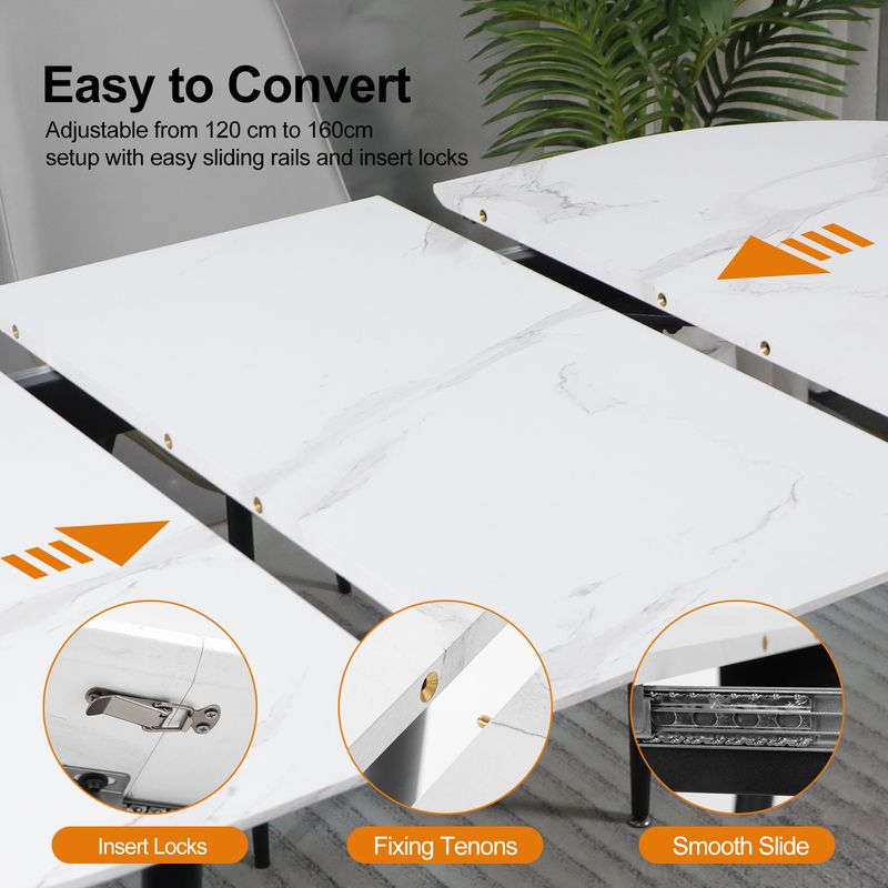 Extendable DesignThis clever dining table features smooth-running glide rails, making changing its size a breeze. Simply slot in the included extra leaf panel and easily transform it from a 120 cm into a much bigger 160 cm dining table. Perfect for when you need extra space, it comfortably seats between 4 and 8 people for meals and gatherings