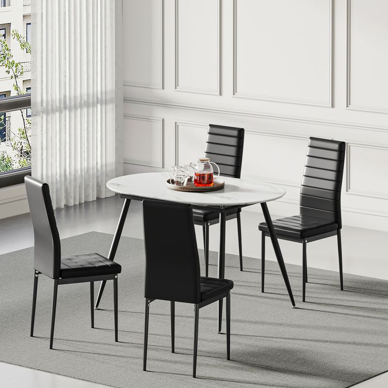 18 mm thick MDF top with a realistic marble effect finish. It's built to last and easy to keep looking smart; simply wipe clean. Paired with sleek black legs, it offers excellent stability on any floor. It’s a tough, good-looking table that brings a touch of industrial style to your dining space