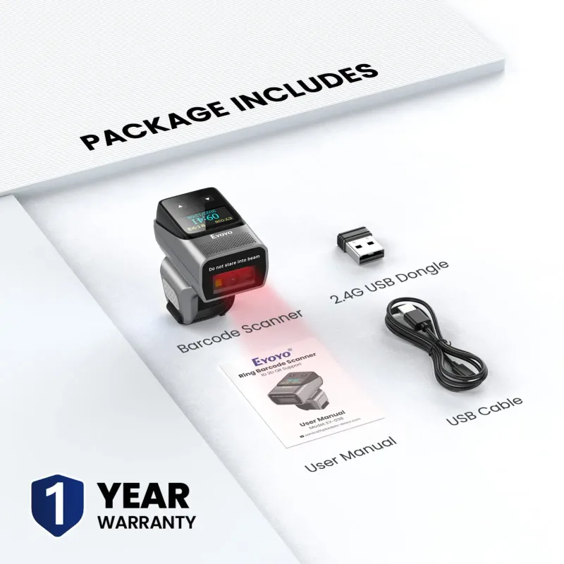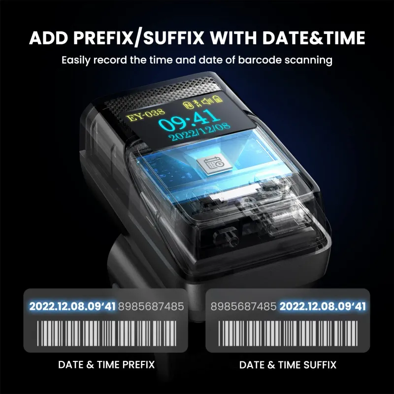 Multiple Configuration Through The Screen Menu: EY-038 ring barcode scanner supports date time stamp, instant upload and storage mode, also supports turning on or off the sound and vibration, adding custom prefix/suffix digits, hide character, adding keyboard keys (TAB, CR&LF, etc.) to the scanning operation and so on.