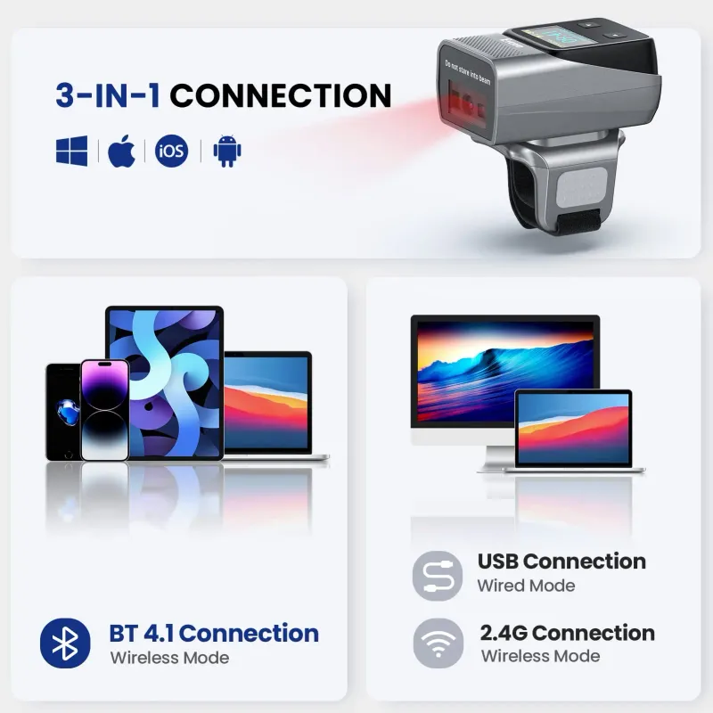 Ring Barcode Scanner With 1-inch Color Display: You can not only get the date&time, remaining battery, Bluetooth/2.4G connection status information from the screen but also set some common functions directly on the barcode scanner without scanning the set code in the manual.