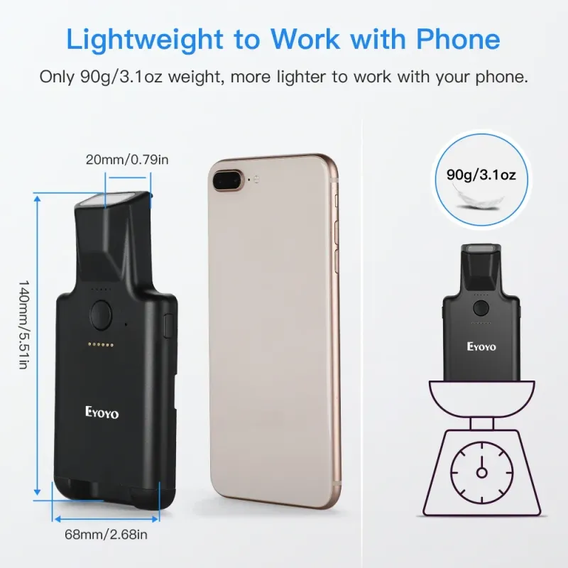 This barcode scanner is the best partner to work with phone, it is designed to clip in the back of your phone, by simple Bluetooth connection operation, when you scan barcode, you can check barcode data or quantity upload on the phone simultaneously, easy to use.