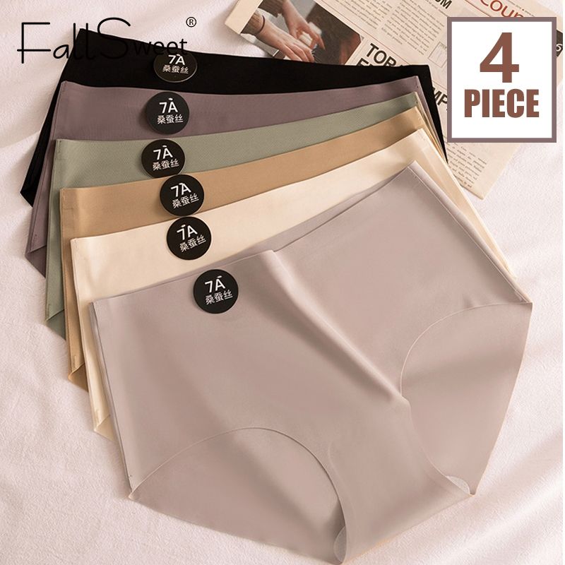 Falllsweet 4Pcs Women Seamless Silk Panties Soft Thin Female Underwear Sexy Mid-Rise Briefs Ice Silk Underpants Lingerie M-2XL