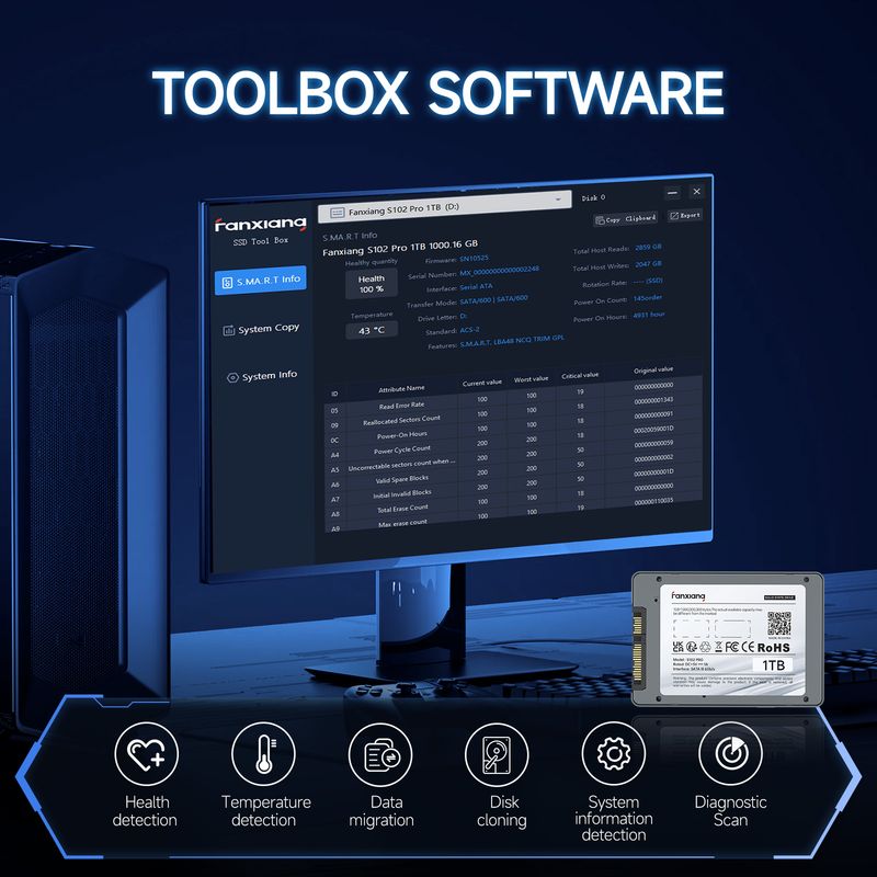 Fanxiang S102 Pro SSD adopts standard 2.5" design,can be easily installed on any motherboard,and is compatible with Windows,Mac OS,Linux and other systems,convenient for you to install and set up