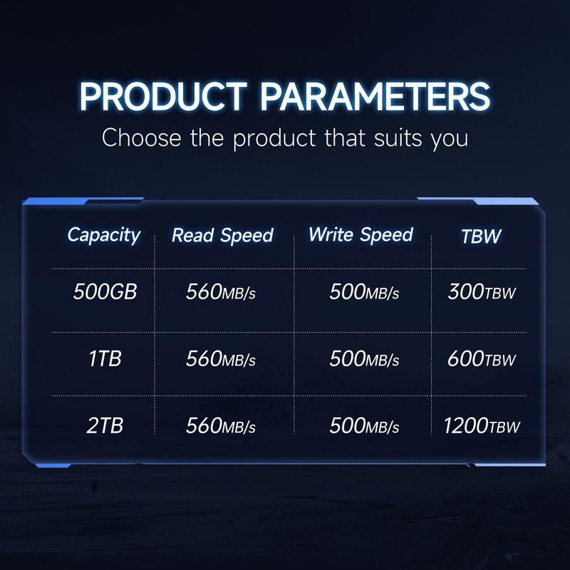 S102 Pro-1TB:Sequential Read Speed up to 560 MB/s;Write Speed up to 520 MB/s.Max to 600TBW.