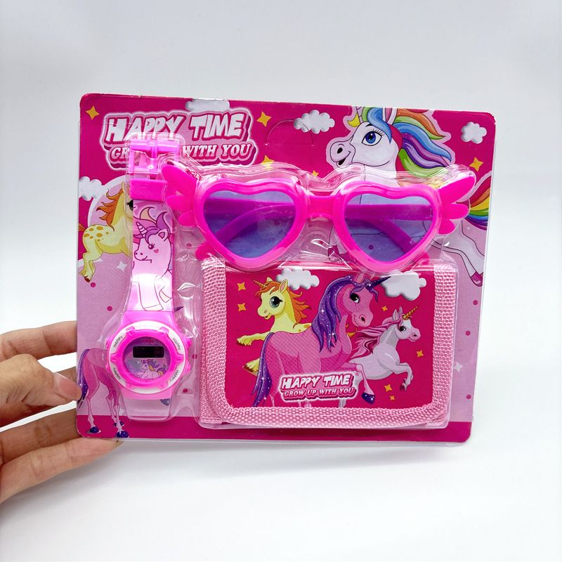 New 3ps Unicorn Hello Kitty Children Watch with Wallet Glasses Cartoon Spiderman Watch for Kids Clock Toys set reloj infantil