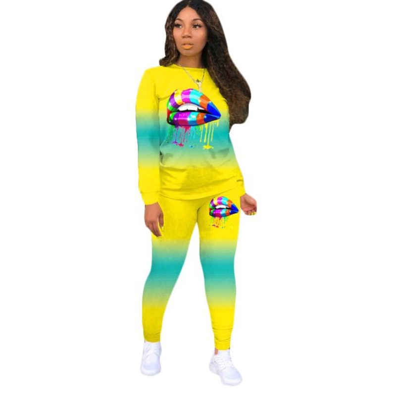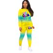 Fashion Casual Gradient Color Lips Print Long-sleeved Trousers Sports Suit Yellow S