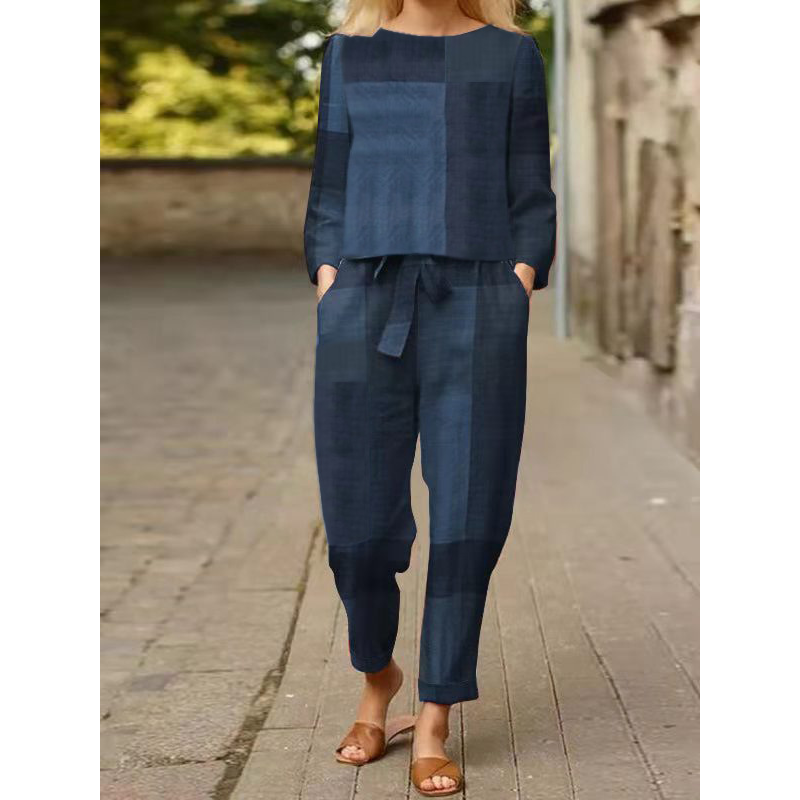 Fashion Casual Ladies Colorblock Long Sleeve Suit Big blue plaid 2XL