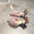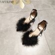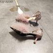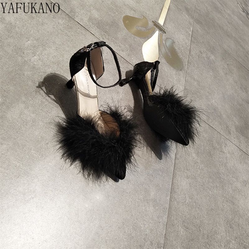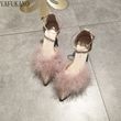 Fashion Hairy High Heels Womens Shallow Mouth Word Buckle Fairy Style Pointed Toe Stiletto Party Dress Shoes Pink Fur Pumps 6Cm