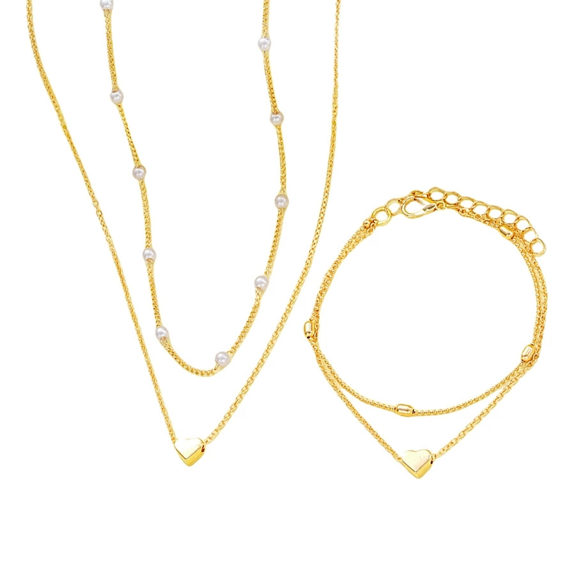 Fashion Imitation Pearl Heart Jewelry Set For Women Gold Silver Color Round Beads Necklace Bracelet Set Daily Wear Accessories